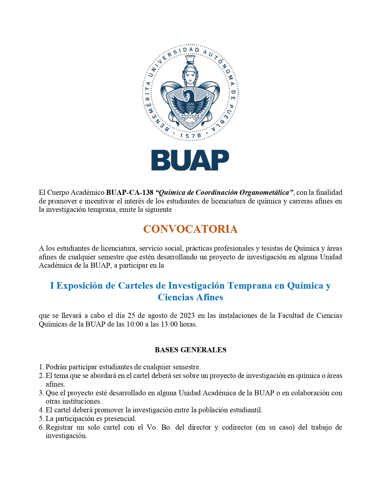 El Cuerpo Académico BUAP-CA-138 “Química de Coordinación Organometálica convoca: a participar: